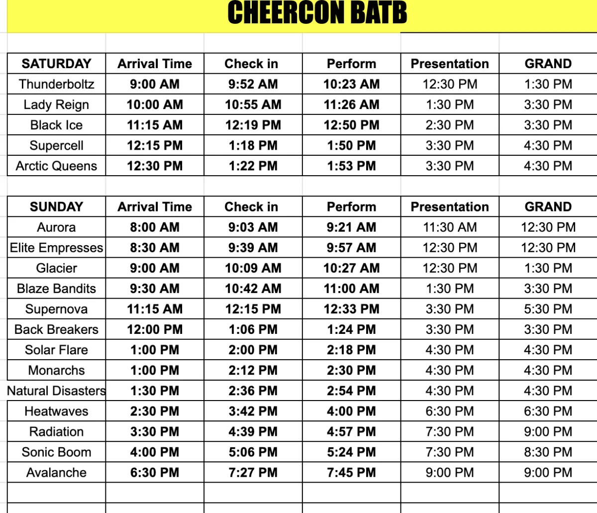 Each team has their own specific arrival time. It is really important that you arrive on time, as this is when the team runs through their routines and prepares with their coach before heading backstage. We will post the meeting spot on Band, so please make sure you are on the app. All students need to come with full hair and makeup, dressed in their costume with their NRG Jacket on.